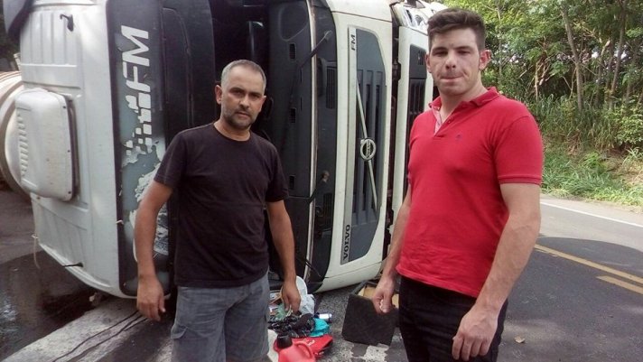 Segundo informou o motorista da carreta, Hélio Gomes Silva (camiseta preta), 40 anos, que estava acompanhado de Claiton de Vecchi (camisa vermelha) , 26, o condutor do carro, Maciel Ribeiro, 34, perdeu o controle.Ele iria bater de frente, mas eu tirei e acabou colidindo na lateral”, contou o gaúcho, que transportava mucosa, feita de “baba de tripa”, usada na produção de heparina animal — principal composto anticoagulante usado em cirurgias.