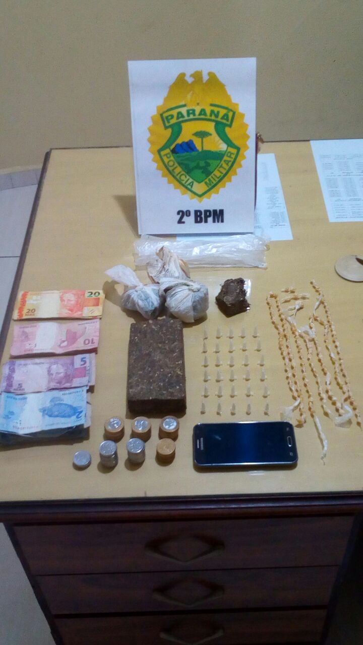 Ontem quarta-feira, 11 de abril, a Agência de Inteligência do 2º BPM realizou diligências visando apurar denúncias de que na Rua 1016, no bairro Aparecidinho III, uma família estaria realizando tráfico de drogas na residência. Então, efetuou-se abordagem em um usuário que deixava aquela casa e com ele encontraram substância análoga a maconha pesando aproximadamente 11 (onze) gramas. Diante do flagrante, os policiais da Agência de Inteligência adentraram a residência e uma mulher (19 anos) tentou fugir pelos fundos da casa com um caixa de sapato nas mãos e foi contida.