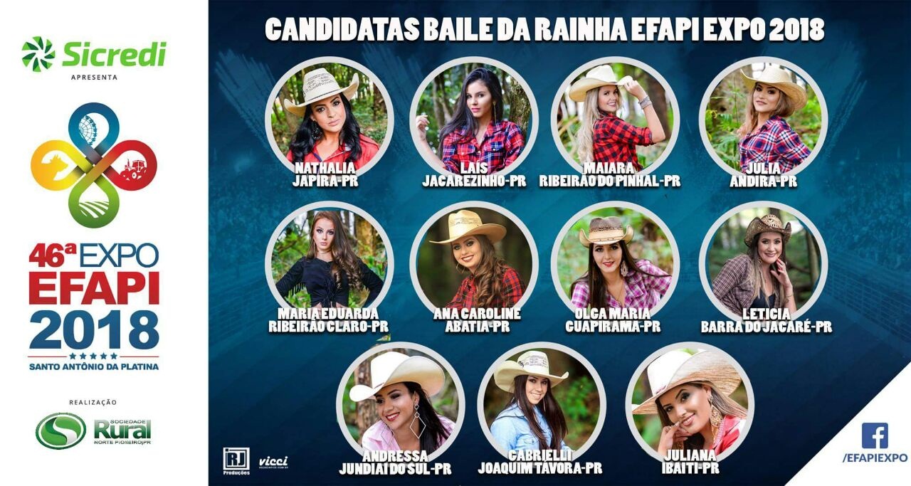 Ao todo, onze candidatas de várias cidades da região, disputam nesta sexta-feira, 20, o título de Rainha e Princesa da 46ª Exposição Feira Agropecuária e Empresarial do Norte Pioneiro – EFAPI – realizada em Santo Antônio da Platina.