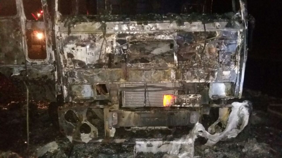 A cabine do veículo foi totalmente destruída pelo fogo, a carreta, porém, foi parcialmente salva pela ação dos bombeiros.
