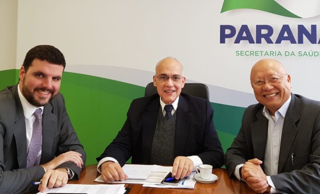 Foto: Deputado Pedro Lupion, secretário estadual de Saúde, Antônio Carlos F. Nardi, e prefeito Hiroshi Kubo.
