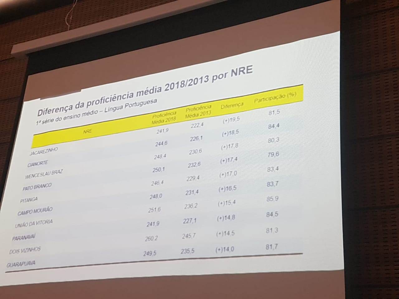 O Núcleo Regional de Educação de Jacarezinho teve o maior aumento na Escala de Proficiência (diagnósticos qualitativos do desempenho escolar) entre os anos de 2013 a 2018 na prova com os alunos dos 1 anos de Ensino Médio. A diferença em Matemática foi de 27.1 pontos e em Língua Portuguesa foi de 19.5 pontos entre as notas apontadas entre os dois períodos. Nas turmas de 6 anos do Ensino Fundamental também aconteceram a avaliação e crescimento.