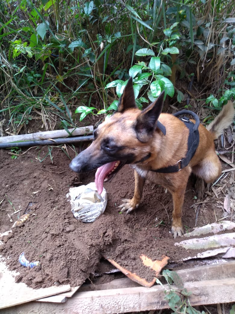 Com auxílio do cão Thor, do Canil/2º BPM, localizaram enterrado no quintal, acondicionado dentro de um pote de vidro, vários tabletes de maconha, pesando 1,131Kg, e uma sacola com vinte e cinco porções de maconha pesando 206g, prontas para a venda.