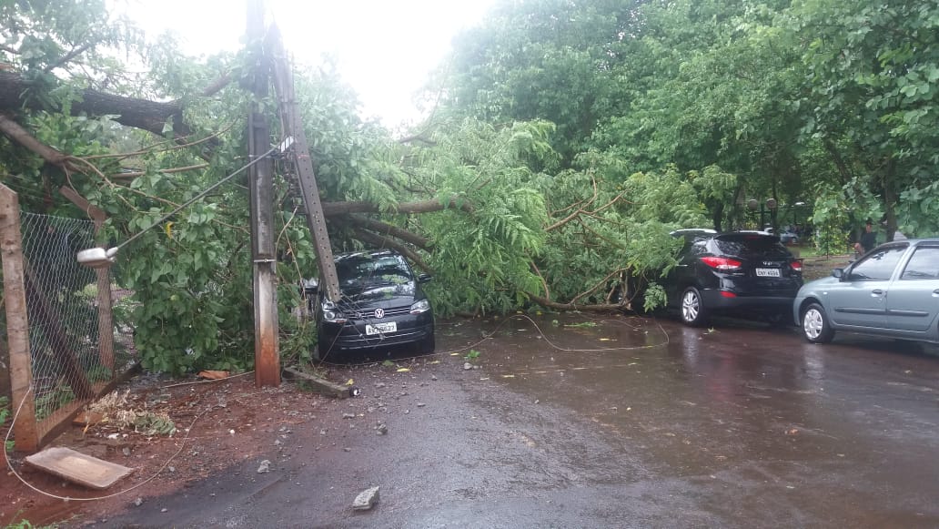 Uma tempestade na tarde desta quinta-feira (3) causou estragos no município de Cambará. A chuva acompanhada de fortes rajadas de vento derrubou árvores sobre carros e um poste da rede de energia elétrica.