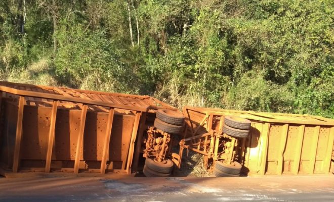 Uma carreta tombou em torno de 14 horas de sábado, dia 17, no KM 37 da BR-153, quando subia a Serra do Palmital, em Santo Antônio da Platina (fotos).