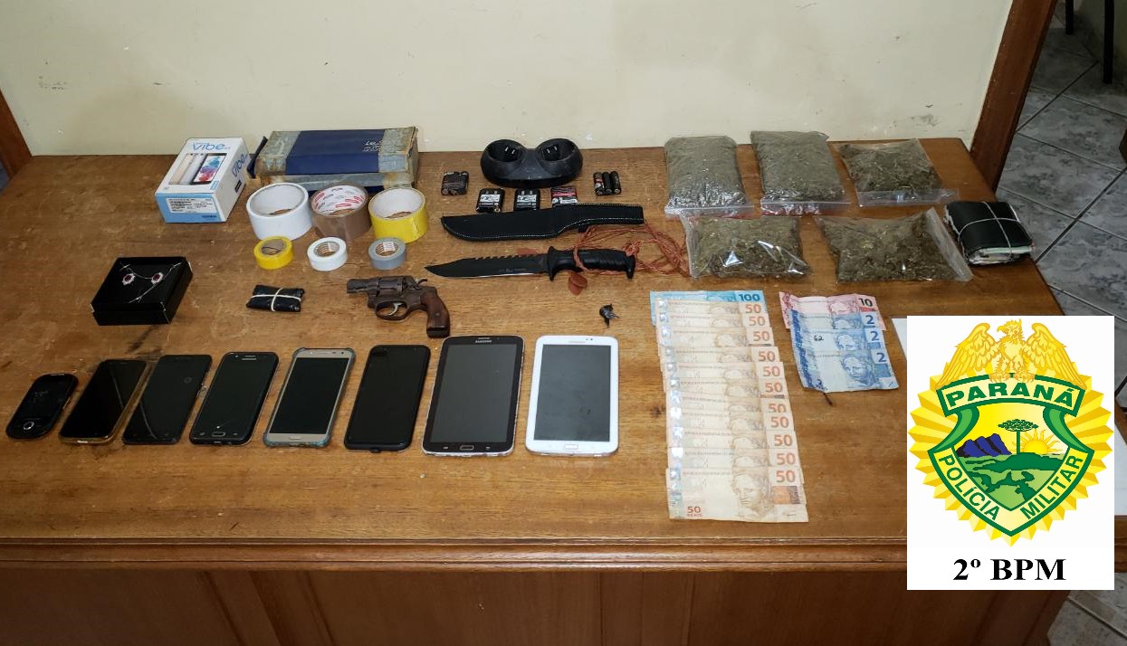 Em um deles na rua Tiradentes – Vila Claro, dois homens (49 e 19 anos) e uma mulher (48 anos) foram conduzidos pois na residência foram localizadas quatro porções de maconha que pesaram 445g, um revólver cal.32 da marca Rossi sem munição, seis aparelhos celulares, dois tabletes, joias, dinheiro e apetrechos para embalagem de entorpecente.