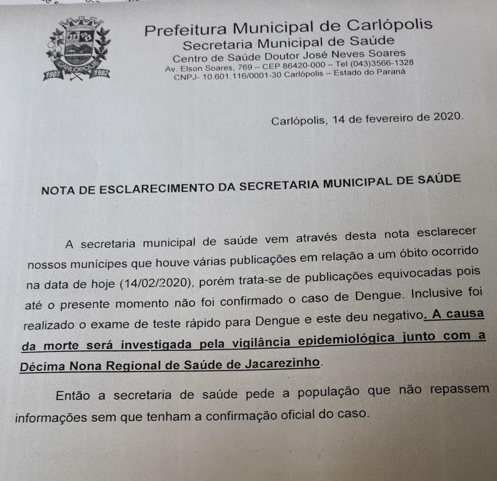 "Trata-se de informações equivocadas, pois até o momento não foi confirmado o caso de dengue. Inclusive foi realizado o teste rápido para a doença na paciente, cujo resultado deu negativo. A causa da morte será investigada pela Vigilância Epidemiológica do município junto à 19ª Regional de Saúde", diz o documento.