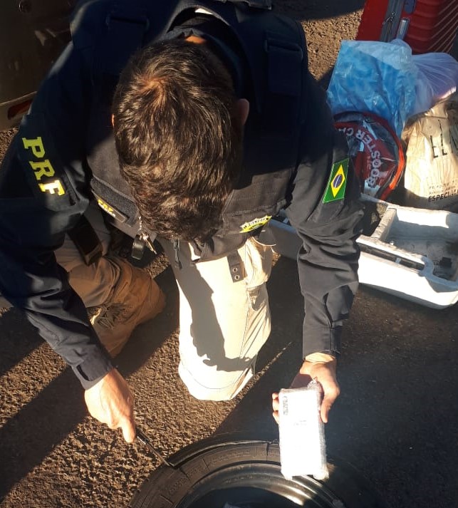 A mercadoria estava escondida dentro do estepe, que precisou ser cortado para retirada dos eletrônicos. Veja o vídeo.