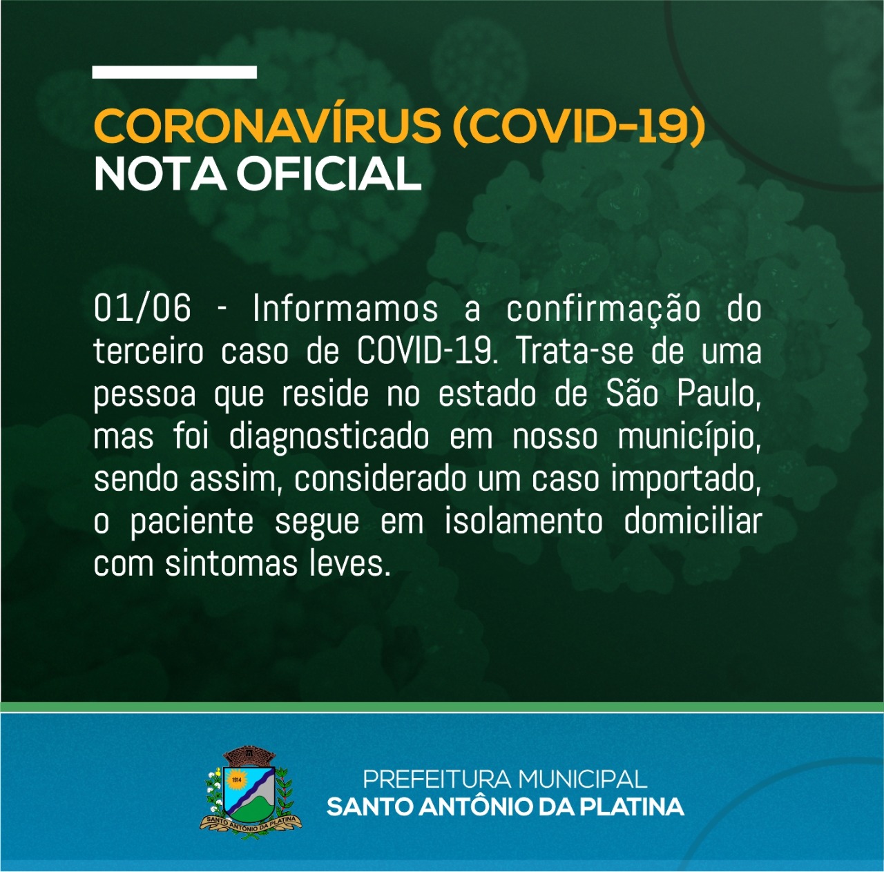 O prefeito de Santo Antônio da Platina José Coelho Neto, o Zezão, e a Secretaria Municipal de Saúde Gislaine confirmaram na tarde desta segunda-feira, 1, o terceiro caso de COVID 19 (Coronavírus) no município. Segundo nota explicativa é uma pessoa que reside no Estado de São Paulo, mas foi diagnosticado no município platinense, sendo considerado um caso importado.