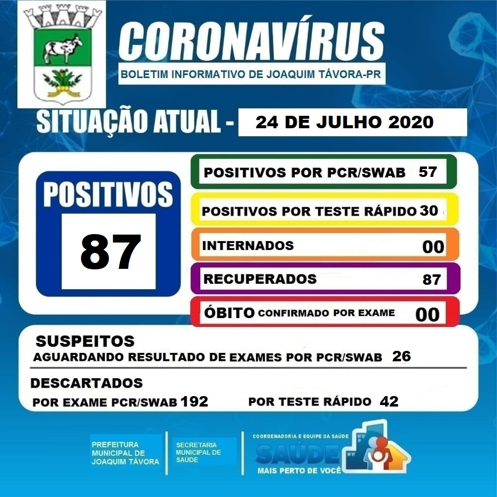 O último boletim epidemiológico divulgado pela secretaria municipal de saúde de Joaquim Távora nesta sexta-feira (24), afirma que não há nenhum caso ativo do novo coronavírus no município, que registrou 87 casos positivos da doença.