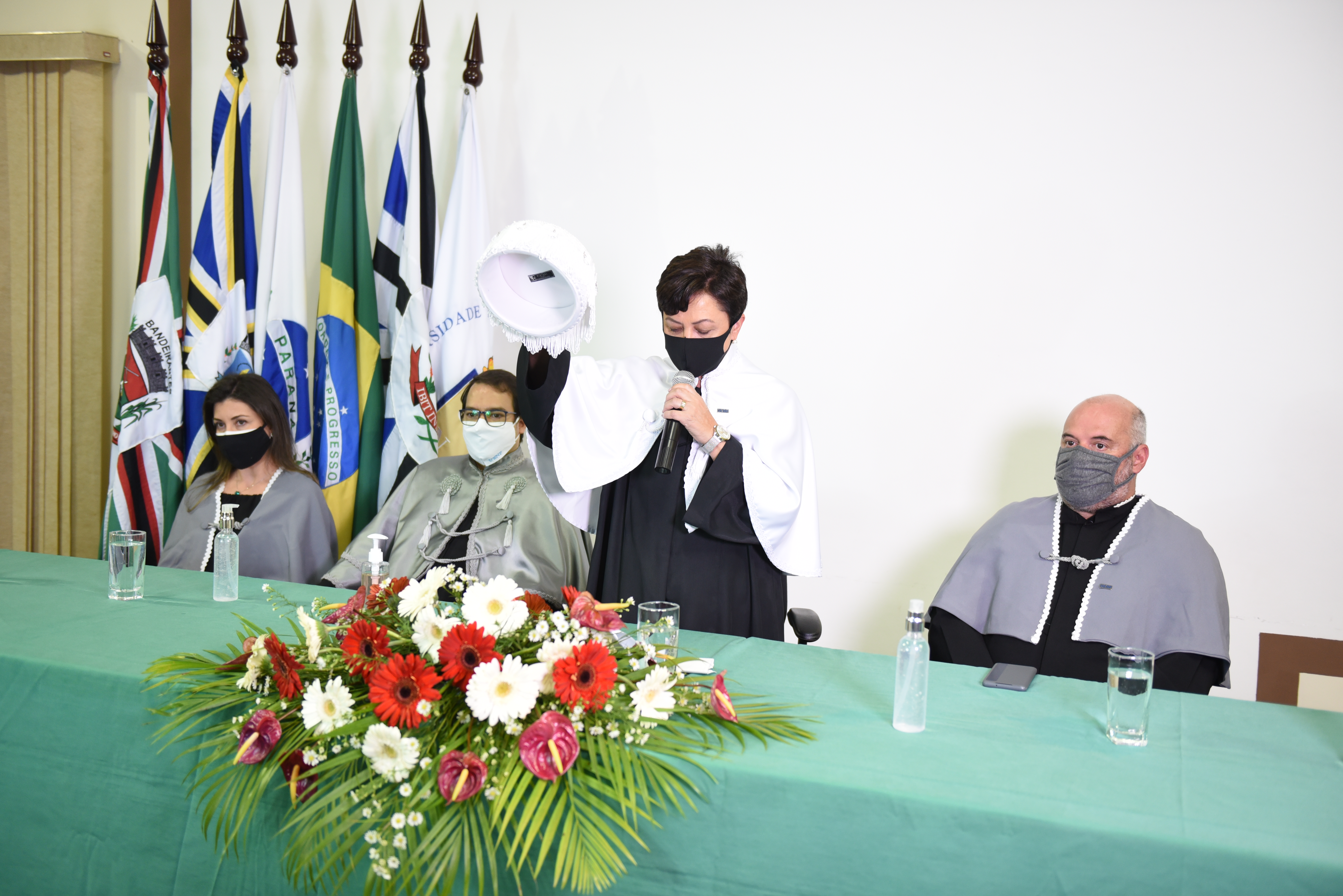 Participaram também da solenidade o vice-reitor da UENP, Fabiano Gonçalves Costa; a pró-reitora de Graduação, Ana Paula Belomo Castanho Brochado; os diretores dos campi de Jacarezinho, Fábio Antonio Neia Martini; de Cornélio Procópio, Thiago Alves Valente; de Bandeirantes (Luiz Meneghel), Ederson Marcos Sgarbi; o coordenador de EAD/UENP, Silvio Tadeu de Oliveira; a coordenadora adjunta da Universidade Aberta do Brasil no âmbito da UENP, Teresinha Esteves da Silveira Reis; a chefe de Gabinete da Reitoria, Ana Rita Levandovski. A transmissão foi acompanhada por parentes e amigos dos formandos no canal da UENP no YouTube (https://bit.ly/3kEumGP).
