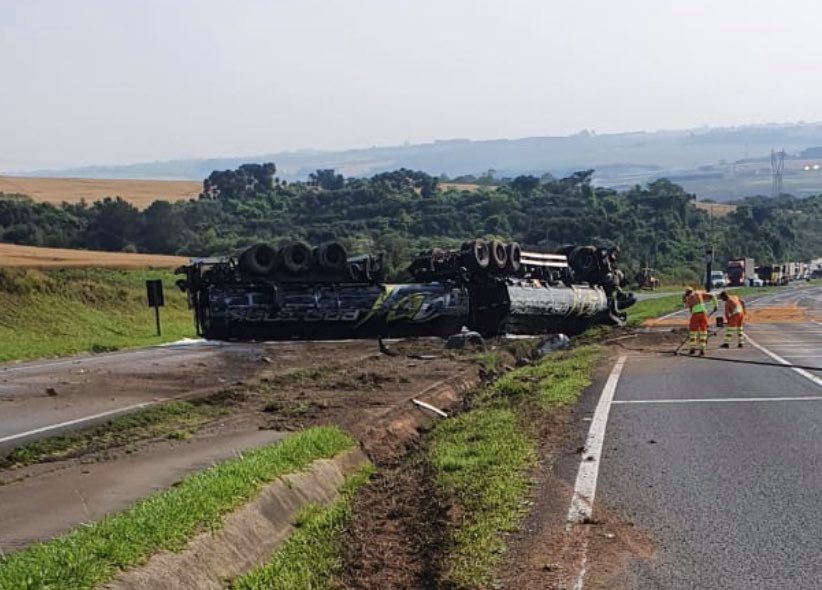 A carreta seguia sentido norte paranaense e São Paulo e atravessou o canteiro central com as rodas para o ar.