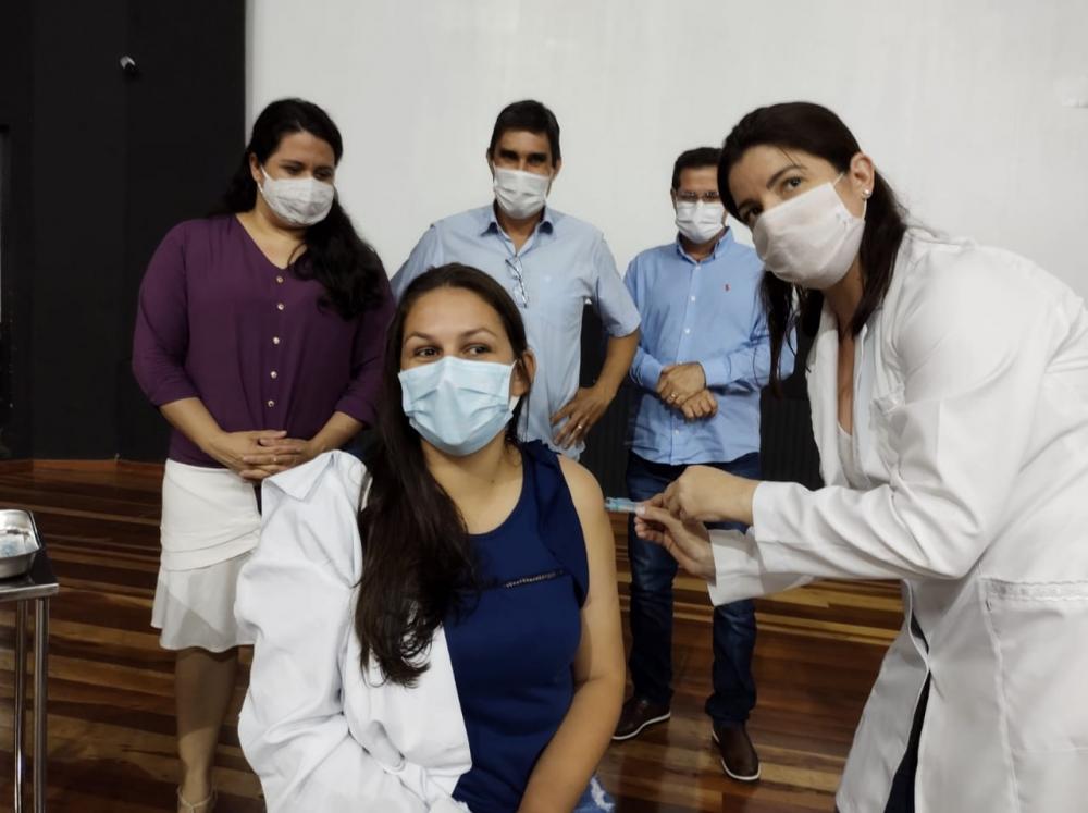 De acordo com a secretária municipal de Saúde, Gislaine Galvão, nesta terça-feira (19) apenas a técnica de enfermagem foi vacinada em ato simbólico realizado na Casa da Cultura que marca o início da imunização contra a Covid-19 na cidade.