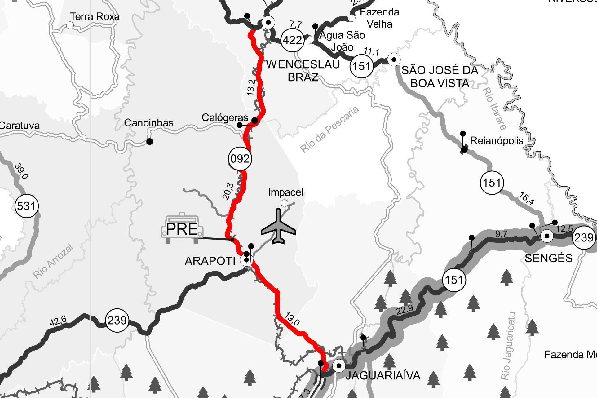 As intervenções estão no rol de Ampliação da Capacidade e Segurança da Rodovia e vão do início da PR-092, no km 200, em Jaguariaíva, até o entroncamento com a BR-153, no km 327, passando por Arapoti, Siqueira Campos, Quatiguá e Joaquim Távora. Esse trecho deve ingressar no Lote 2 da nova concessão dos pedágios, mas a melhoria antecipará a segurança para os usuários em alguns anos.
