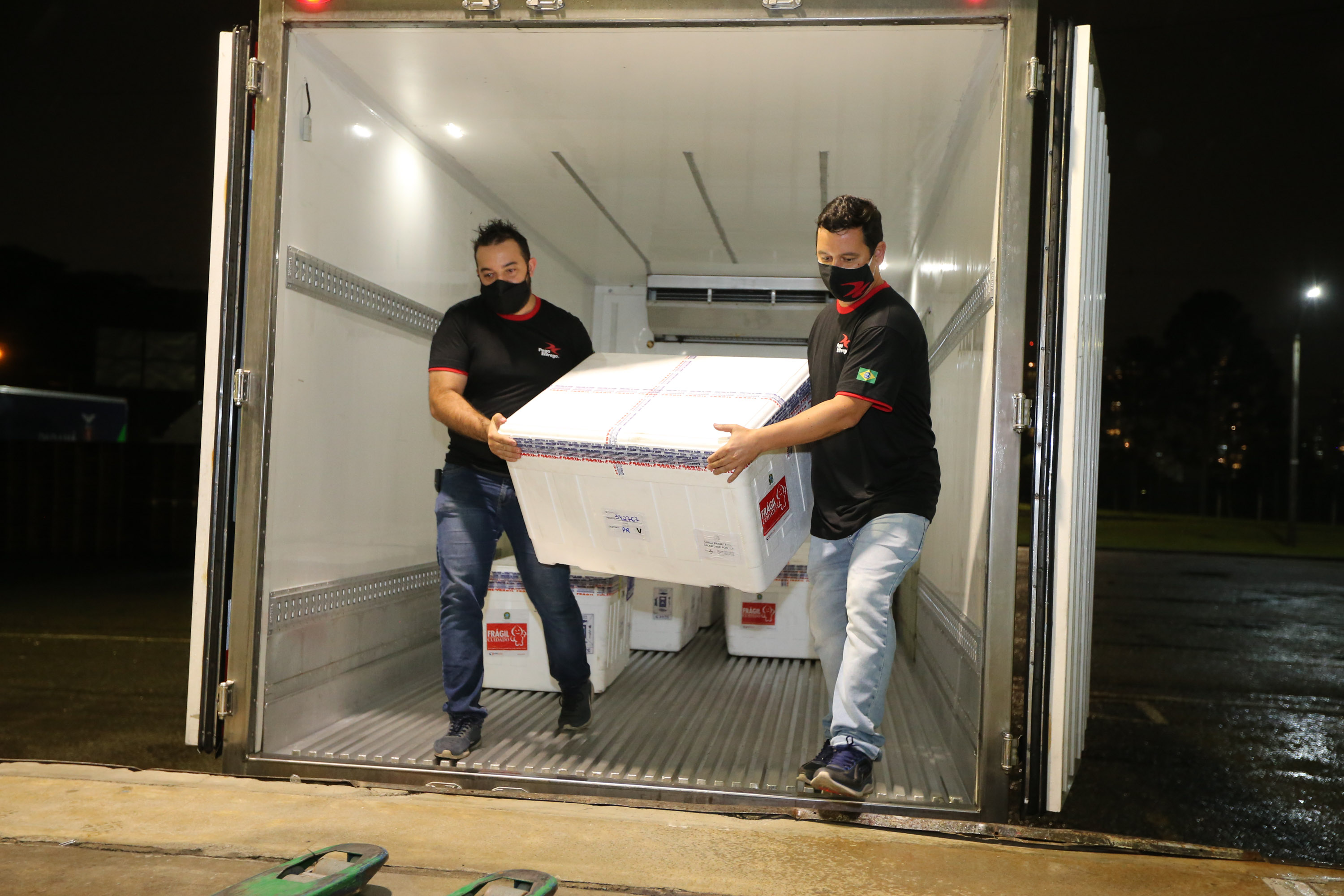 A Secretaria de Estado da Saúde recebeu na noite desta quarta-feira (24) uma remessa com 64.800 doses da vacina CoronaVac/Instituto Butantan. Elas chegaram em um voo comercial por volta das 20 horas no Aeroporto Internacional Afonso Pena, em São José dos Pinhais, e em seguida foram levadas ao Centro de Medicamentos do Paraná (Cemepar). A distribuição para as regionais de Saúde começa nesta quinta-feira (25).