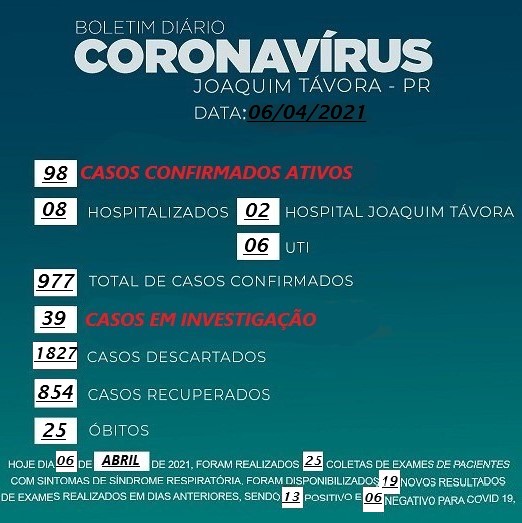 Um homem de 54 anos, que havia sido diagnosticado com coronavírus, é a 25ª vítima fatal da pandemia em Joaquim Távora .Ele estava internado na Santa Casa de Jacarezinho e veio a óbito no final da manhã desta terça-feira (06).