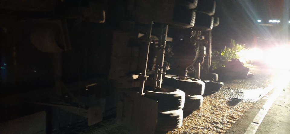 Uma carreta com placas de Ponta Grossa (PR), corregada com milho tombou por volta das 23h40 desta sexta-feira (16), no km 136, próximo a uma curva na BR-153 em Ibaiti.