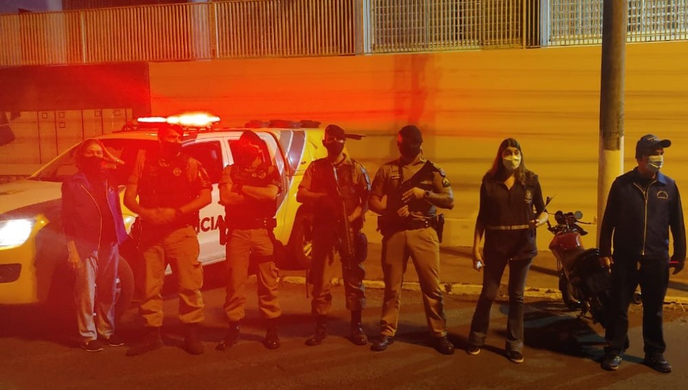 As equipes de Rádio Patrulha, ROTAM e CANIL deram apoio à vigilância sanitária, guarda municipal e defesa civil para fiscalização de estabelecimentos e averiguação de denúncias quanto a festas irregulares com aglomeração.