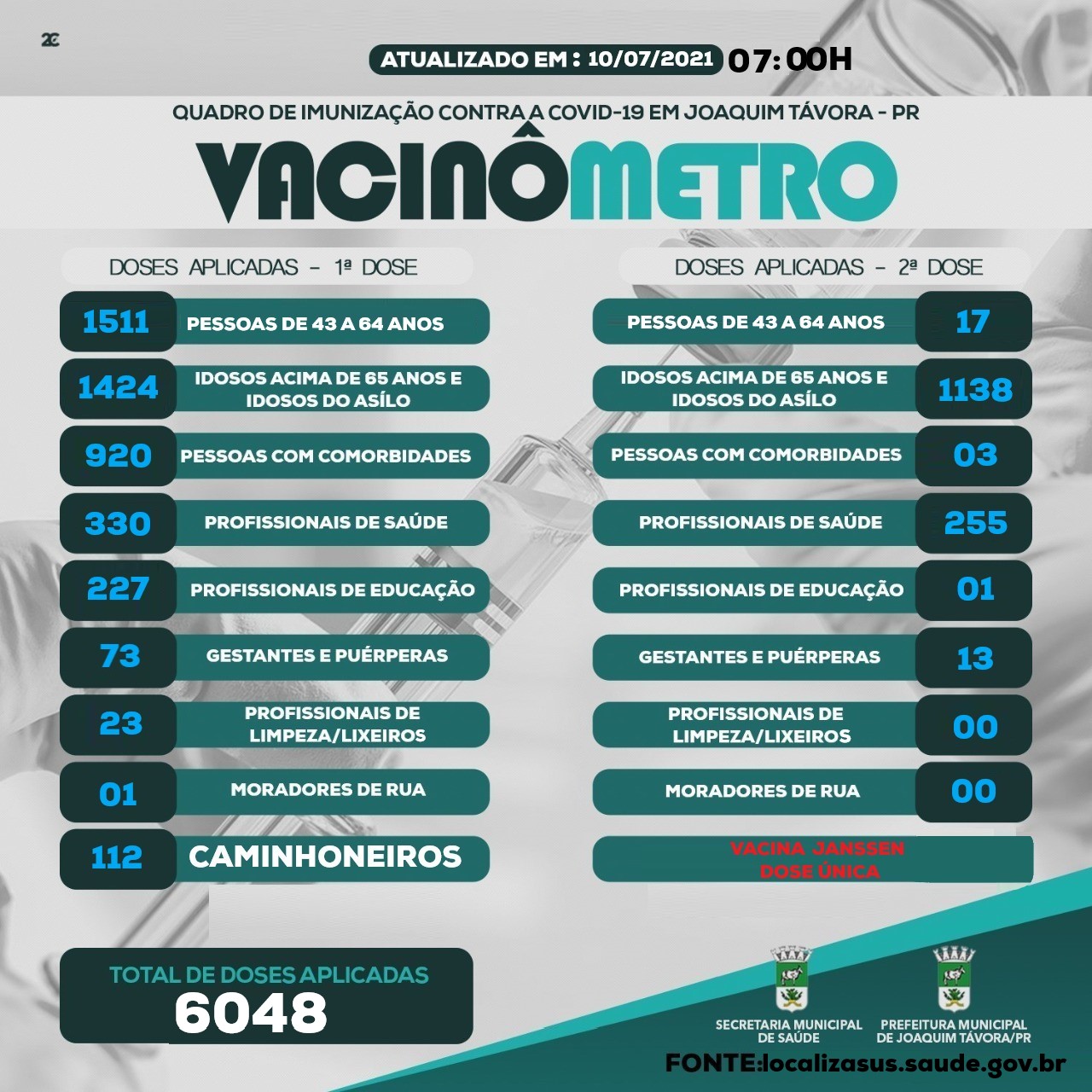 O município chegou nesta semana a marca de 6.048 doses aplicadas da vacina contra a Covid-19, esse número contempla a soma da 1ª e 2ª doses.