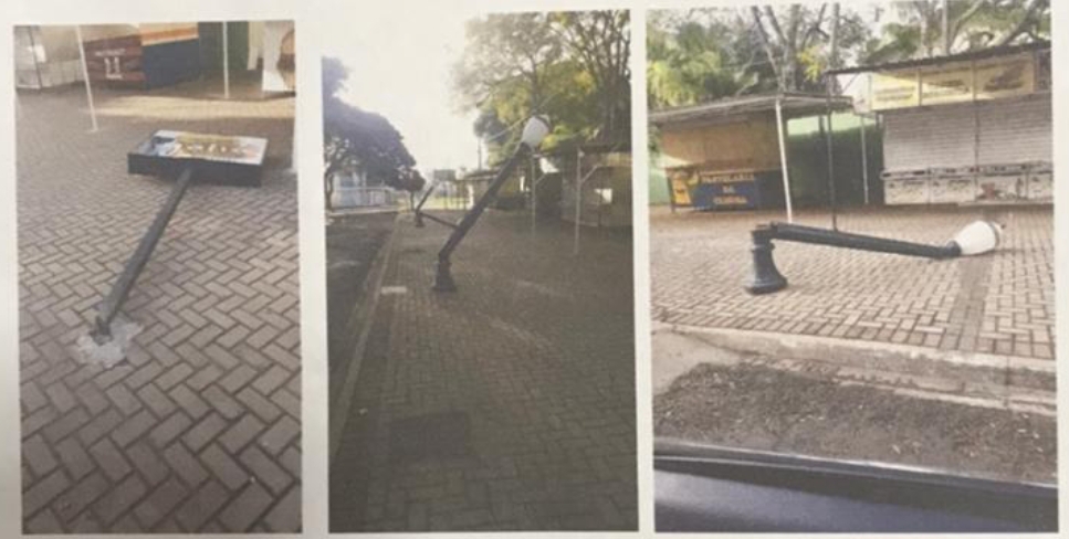 Alguns postes de iluminação pública e de publicidade foram danificados (fotos). O fato chamou a atenção dos munícipes devido ao cenário de abandono.