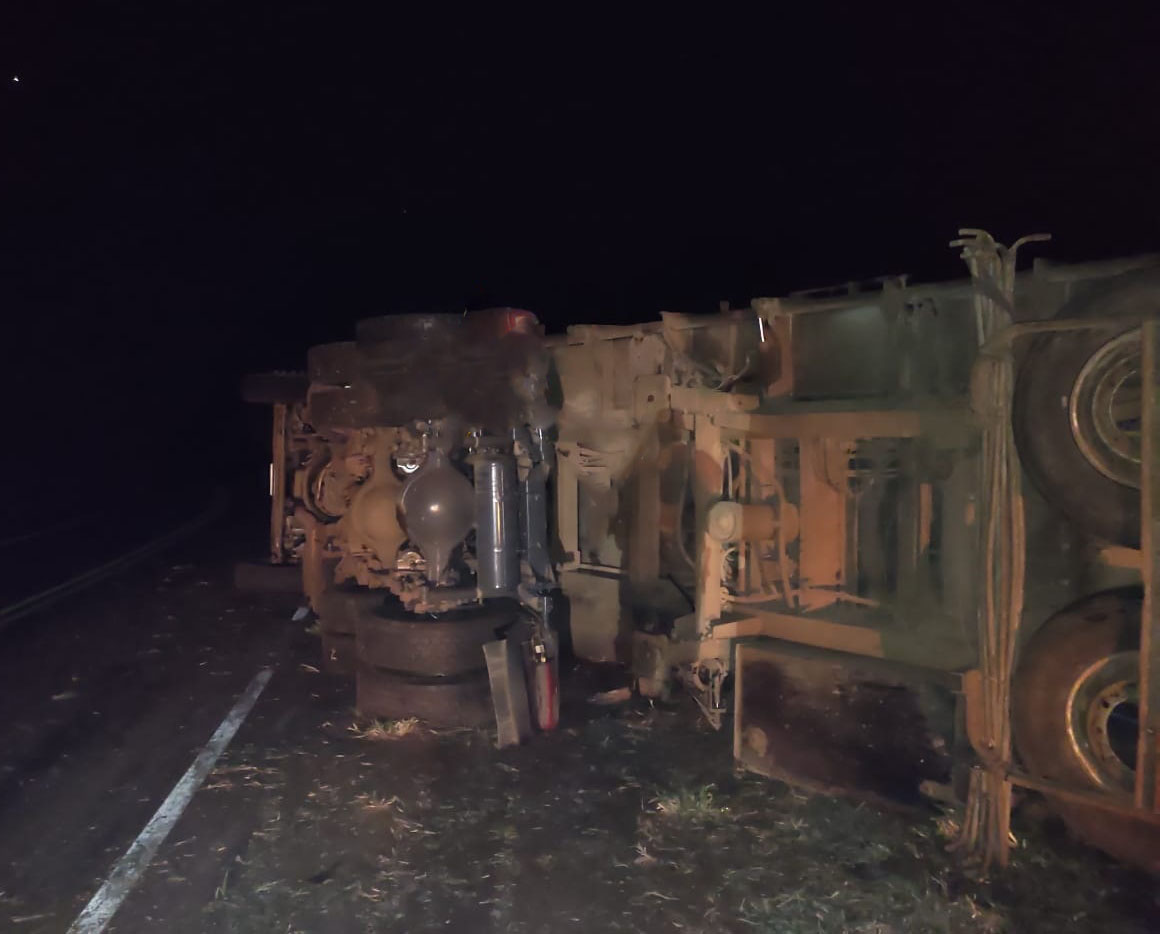 A carreta DAF/XF105 (placas de Fartura/SP) tombou, mas o condutor de 41 anos anos não se machucou.