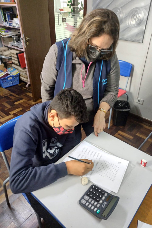 Na sala de recursos multifuncional do colégio, onde é ofertado o Atendimento Educacional Especializado, Jaqueline trabalha, também, com estudantes do 6º ao 8º ano do ensino fundamental, da educação especial. No contraturno, ela dá aulas de Língua Portuguesa para o 6º ano do ensino regular.