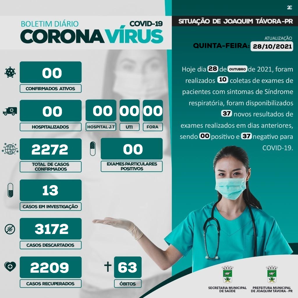 O número de casos ativos da Covid-19 em isolamento domiciliar foi zerado nesta quinta-feira (28/10), em Joaquim Távora.