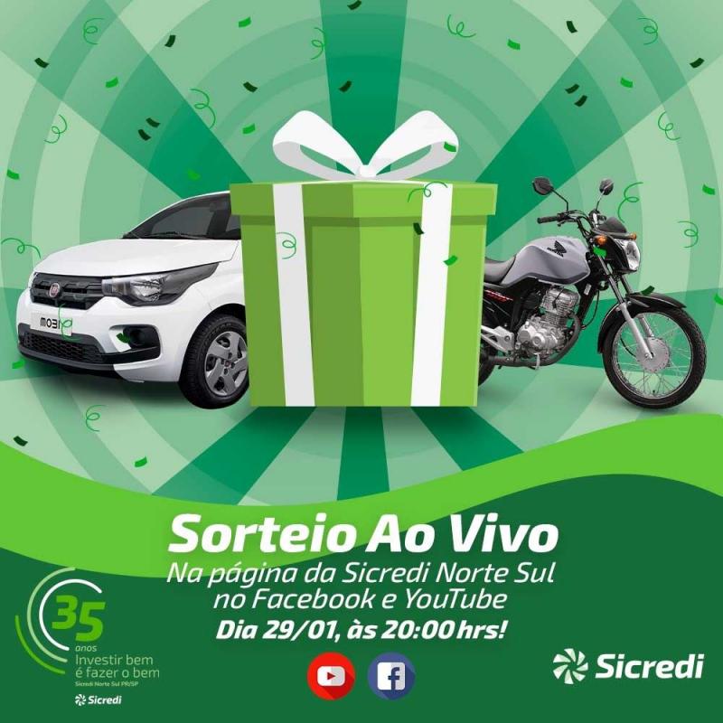 Nesta sexta-feira, dia 29 , a Sicredi Norte Sul sorteará um Fiat Mobi 0 km e uma Moto Honda CG 160 0 km. Os prêmios fazem parte da Campanha Investir Bem é Fazer o Bem comemorativa aos 35 anos da cooperativa.