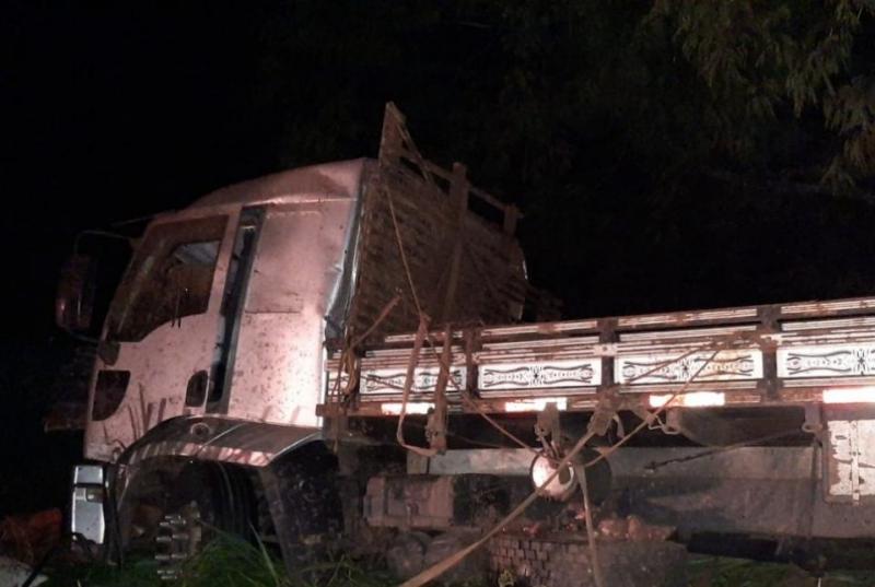 Um caminhão carregado com batatas saiu da pista e colidiu com um barranco na altura do km 118 da BR-153, entre Ibaiti e Ventania no início da madrugada desta terça-feira (19).