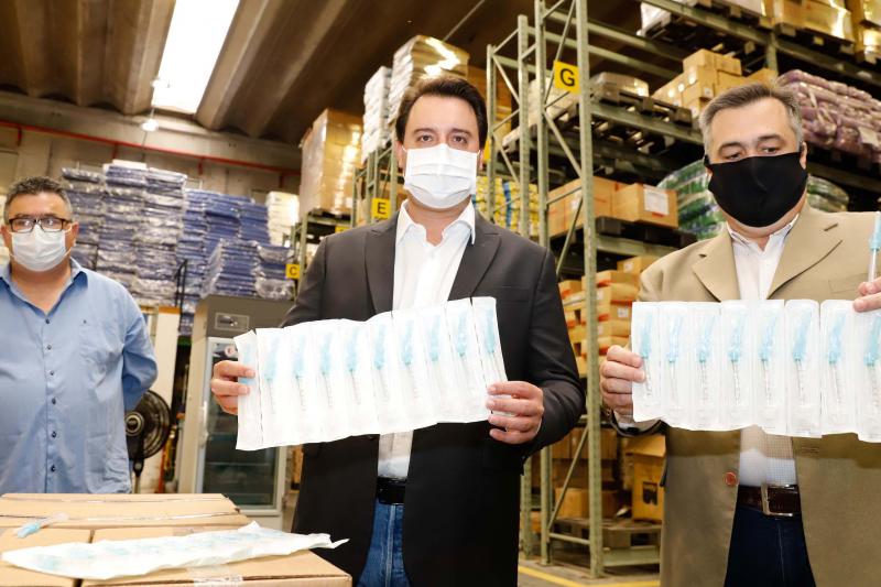 O governador Carlos Massa Ratinho Junior vistoriou nesta quarta-feira (12) o estoque dos chamados insumos secos que o Paraná já tem disponível para iniciar o processo de vacinação contra a Covid-19. São agulhas, seringas, máscaras, luvas, aventais e |