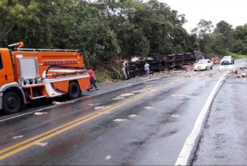 Um caminhão carregado com papelão para reciclagem tombou na madrugada deste sábado (05), no km 125 da BR-153, entre Ibaiti e Ventania.