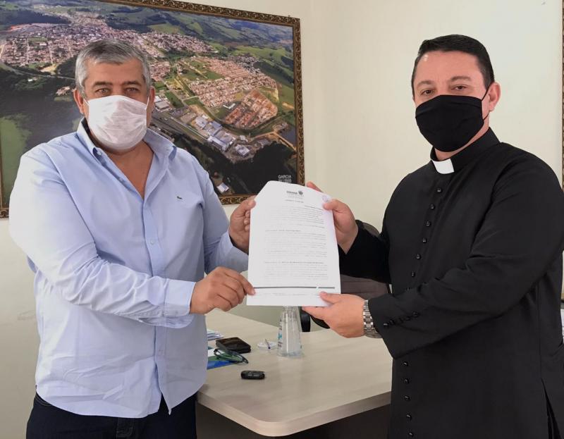 O prefeito Gelson Mansur Nassar recepcionou em seu gabinete o pároco tavorense e reitor do santuário santíssimo nome de Jesus Pe. Valdemir Granzzoto de Mores e |