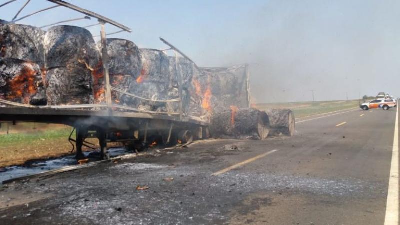 Uma carreta que transportava bobinas de papel de Telêmaco Borba para Poá (SP) pegou fogo no início da tarde desta quinta-feira (13) na BR-153, próximo ao entroncamento com a PR-218, na divisa entre os municípios de Jundiaí do Sul e Guapirama.