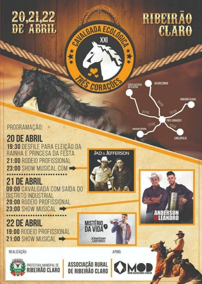 A prefeitura de Ribeirão Claro convida toda região para participarem da 21ª edição da Cavalgada Ecológica dos Três Corações, que acontece no bairro rural Três Corações entre os dias 20 e 22 de abril. A festa |