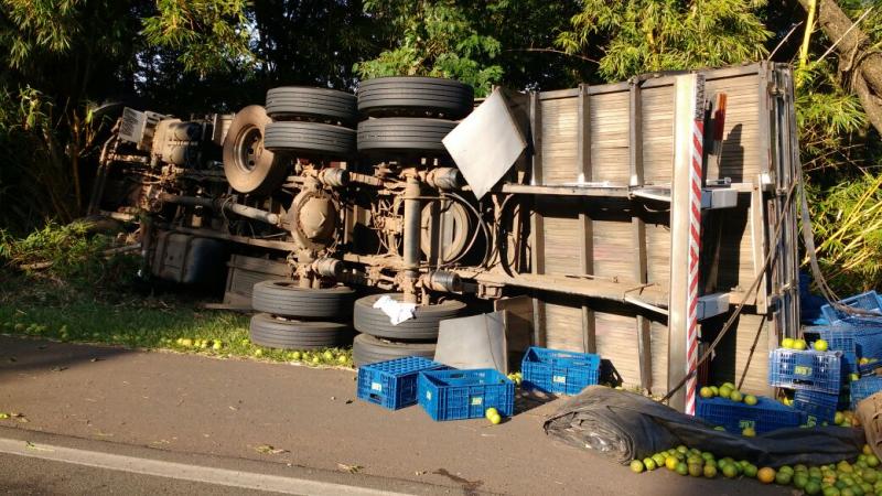 Um caminhão carregado com laranjas tombou na manhã desta quinta-feira (12) no Km 38 da BR-153, na Serra do Palmital, em Santo Antônio da Platina. O motorista teve apenas ferimentos superficiais. Ele informou que seguia de Bauru (SC) com destino a Santa Catarina, e que teria |