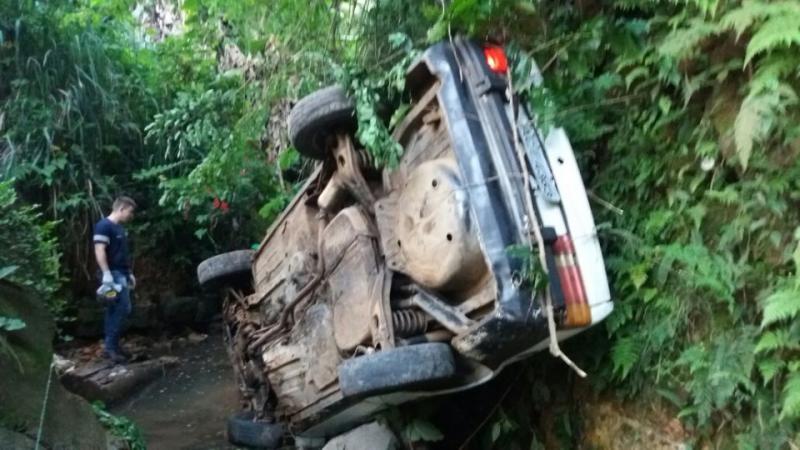 Um Ford Escort com placas de Japira, ocupado por três honens caiu no córrego que divide os dois |