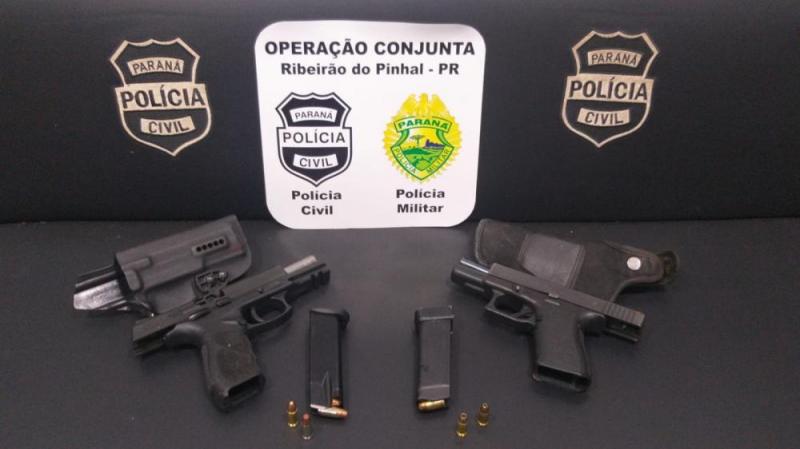 Ação conjunta entre policiais civis e militares na tarde deste segunda-feira (26) resultou na detenção de dois homens, com idades de 38 e 52 anos, e apreensão de duas armas de fogo, tipo pistola, calibres .380 e 9 milímetros, na zona rural de |