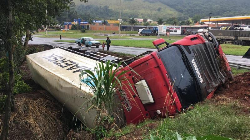 Uma carreta tombou na manhã desta quinta-feira (10) no trevo de acesso a Santo Antônio da Platina/PR, próximo à base da Polícia Rodoviária Federal (PRF).
